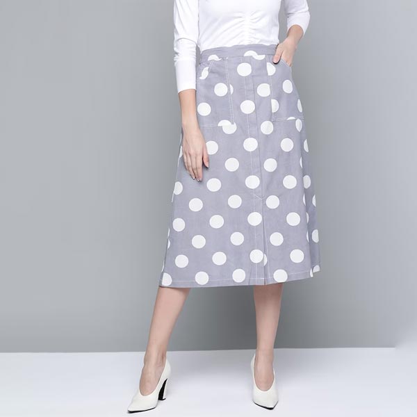0 review(s) for "Grey & White Polka Dot Print Cotton Linen Front Slit Midi A-Line Skirt"